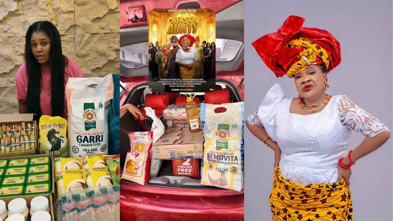 Toyin Abraham has taken movie-premiere invites to another level entirely. While many stars send out pretty boxes with a few fancy items tucked inside, Aunty Toyin said, “Not today.” For her upcoming film Oversabi Aunty, hitting cinemas nationwide from December 19th, she sent an invite so generous it couldn’t even fit in a box.